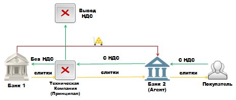 Впоследствии денежные средства, полученные в счет оплаты драгоценного металла, перечисляются Банком Принципалу, который в свою очередь направляет часть полученной суммы на приобретение драгоценного металла по договорам ОМС без уплаты НДС, сумма неуплаченного НДС выводится за рубеж или обналичивания.