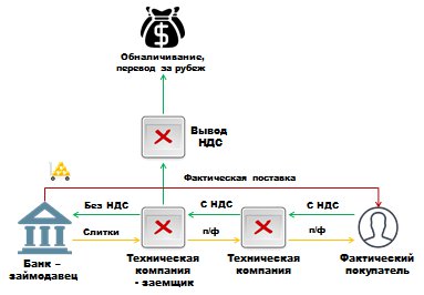 Впоследствии полученный по договору займа металл реализуется через цепочку фирм-"однодневок", при этом реализация металла происходит с начислением НДС, без соответствующей уплаты налога. Сумма неуплаченного НДС обналичивается или выводится за рубеж.