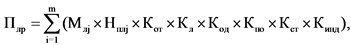 Сумма платежа за выбросы загрязняющих веществ, определенная суммарно по всем загрязняющим веществам исходя из значений объема или массы выбросов загрязняющих веществ, равных значениям нормативов допустимых выбросов на текущий отчетный период, умноженных на соответствующие ставки платы (Пндв), определяется по формуле: