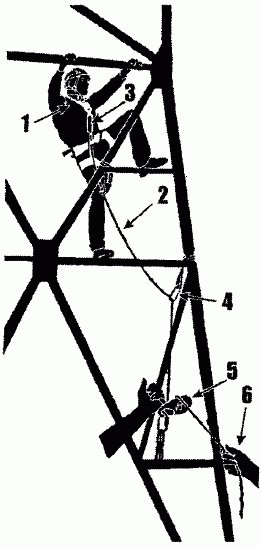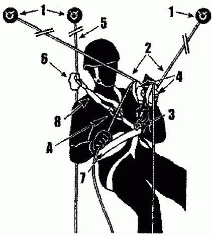 5 - устройство, приводимое в действие вручную и создающее трение, которое позволяет страхующему совершать управляемое перемещение страхующего каната и остановку "без рук" в любом месте на страхующем канате;