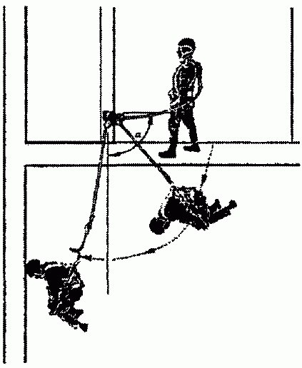 Для обеспечения постепенного (плавного) гашения динамической нагрузки (рывка), которая возникает в случае падения работника, страхующий должен вначале протравить канат путем свободного его пропускания через тормозную систему примерно на длину, равную 1/3 высоты ожидаемого падения работника, а затем обеспечить остановку падения и удержания работника.